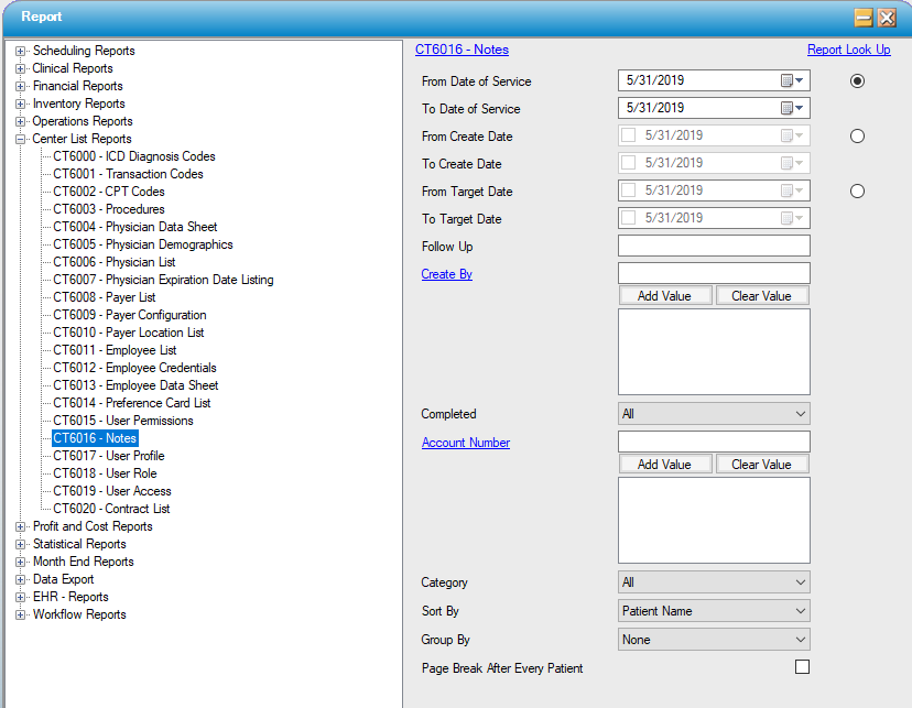 Filter by Date of Service, Create Date range, Target Date range, Follow Up user name, Completed flag (yes or no), specific patient Account(s), or Notes Category.