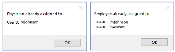 PLEASE NOTE: This validation will only occur when either the Physician or the Employee field is changed. If the User Profile record is existing with a duplicated Linked ID, and some other field is changed, there will not be a validation for either of these fields. Please use the User Profile Data Export to determine if there are any duplicated linked records. See the Before You Begin help file for directions on finding duplicated linked records.