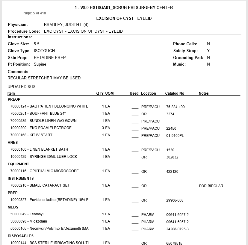 Basic information on the Physician Preference Card.  Includes general information, procedure comments and items.  Prints a new page for each Preference Card if multiple cards selected.