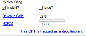 NOTE: If the HCPCS Code has been categorized as a drug or implant in CPT Code configuration, an alert will be visible here to remind users to check that box here as well.