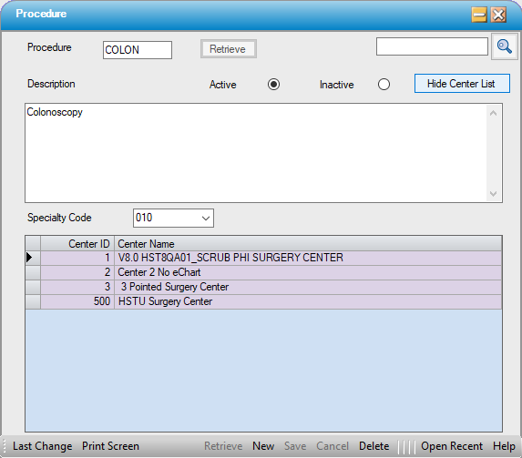 Procedures is where the procedures specific to a center or organization are defined Procedures can be created, deleted, or inactivated via this form.