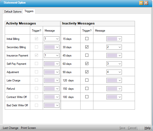 Activity Messages will be generated when the specified Activity is performed. Example: If the Trigger? for Insurance Payment is checked, then posting an Insurance Payment will trigger a statement unless other Default Options (such as suppression criteria or balance is transferred to another payer other than Self-Pay) prevent it.