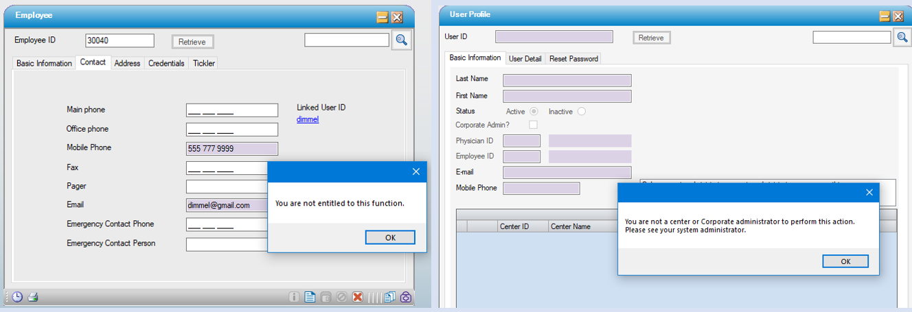 Access Permissions When using the hyperlink to launch the user profile, and the appropriate permissions are not granted, the standard message regarding access will be presented. Clicking OK on this message will load the User Profile form with a message regarding access to that form.